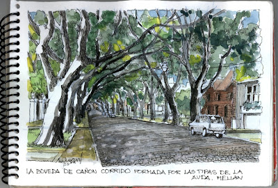 Imagen de la Avda Melian, en Belgrano R. Me impactan las espectaculares tipas que forman una bóveda de cañón corrido, que acompaña a la Avda. flanqueada por tambien espectaculares mansiones, definiendo hoy un barrio de clase media alta. Hasta mediados del siglo XIX, la traza de Avda. Melian era sólo escenario de carreras cuadreras.